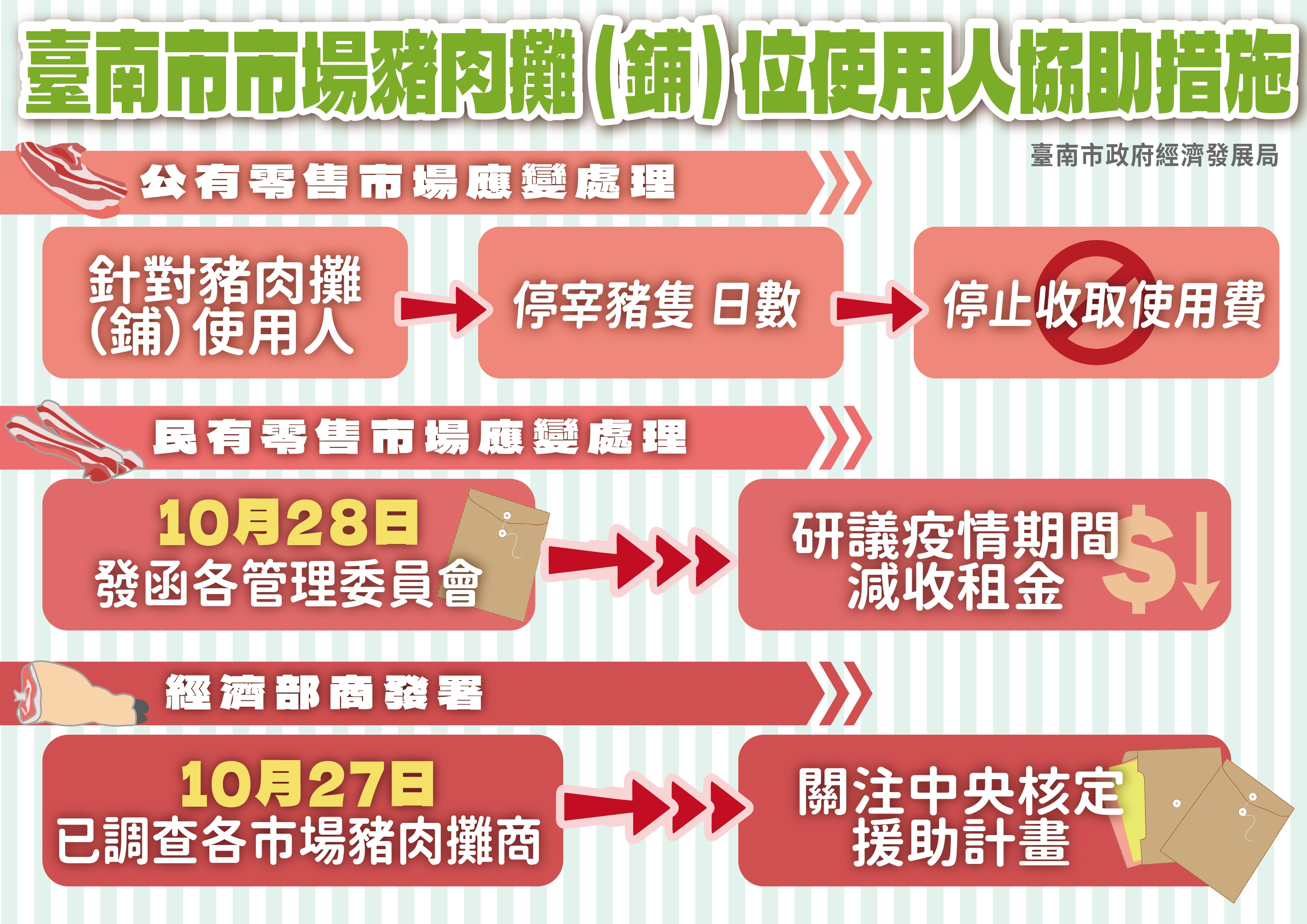 因應非洲豬瘟疫情影響,部分傳統市場豬肉攤商依中央防疫規範暫停營業。臺南市共有59處公有零售市場,約290攤豬肉攤。為減輕攤商負擔,臺南市政府宣布,將免收公有零售市場豬肉攤商1個月之使用費;另外針對58 ...更多