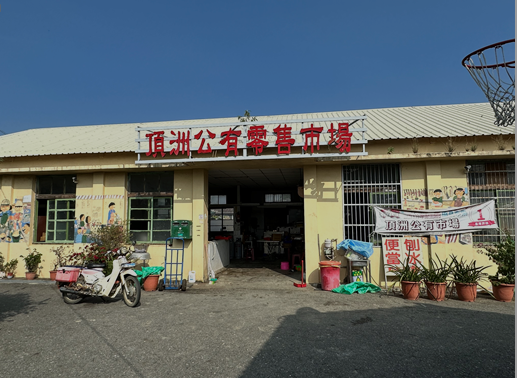 一、沿革 頂洲市場自60年建造至今,牆面繪有小朋友的彩繪圖畫,是個小而美的市場。 二、簡介 電話:06-6356501 營業時間:6:00-12:00(周一公休) 攤位數:9 地址:學甲區頂洲里三慶里頂洲114號 三、地圖