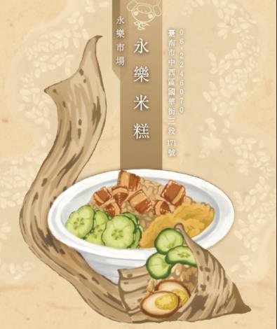 ♦ 簡介:從一根扁擔開始,飄香一甲子、傳承三代的美味米糕滿足臺南人刁鑽的味蕾!永樂米糕的糯米飯有別於一般木桶蒸煮,是用傳統鍋具加上特製木板,這樣的特別煮法完全是靠經驗累積;淋上肉燥、花生、魚鬆、與醃漬菜,讓米糕不僅僅是鹹味的享受,還增添了一絲甜酸的風味。再配上一碗Q彈豬腸清爽的四神湯,絕對是念念不忘的好滋味。