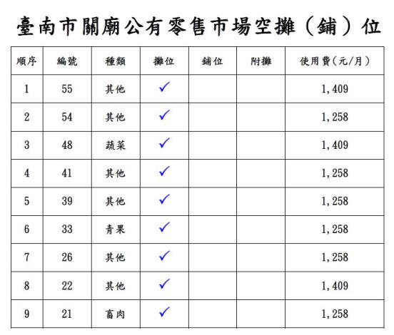 臺南市市場處依據「零售市場管理條例」第9條第1項第4款,於臺南市市場處公告欄及關廟公有零售市場公布欄,自民國114年12月19日上午8時至民國114年12月25日下午5時止,公告關廟公有零售市場共計9攤(鋪)位公告申請使用,攤(鋪)位與使用費數額詳如附件所列。