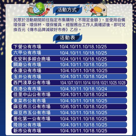 市場處處長陳豪吉表示,經濟部「傳市品牌 減碳好市券」活動,本次參與的市場有下營、六甲、永康、玉井、西門淺草、西港、佳里中山、東菜市、麻豆市三、麻豆市五、善化第一、隆田、新市、關廟公有市場及北安利多綜合商場,夜市有玉井、佳里傳統、武聖、復華、新永華、鄭仔寮花園、鹽水夜市。原則上,傳統市場活動時間為每週三上午八點,列管夜市活動為每週六下午六點,各市場詳細活動時間與方式詳如附件時間表。歡迎市民朋友至本市市場夜市消費並領取減碳好市券、吃美食、樂購物。