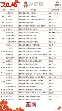 臺南市市場處代理處長林士群也表示,今年除夕適逢週一,原週一營業之夜市,包括大東、大東東、仁和、永大、中興、鹽行、麻豆、什二佃、關廟等夜市,照常營業,方便市民與返鄉遊子團圓出遊。除此之外,南臺灣唯一五星夜市-花園夜市,特別增加營業日,年節期間連續營業11日;適逢假日即營業的府中街市集,也推出一系列特別活動,各種文創是親子走春必訪;還有歷久不衰台南人的共同回憶-小北觀光夜市,當然也不會缺席;這些市集春節期間每天都有營業,陪伴民眾一起過新年。